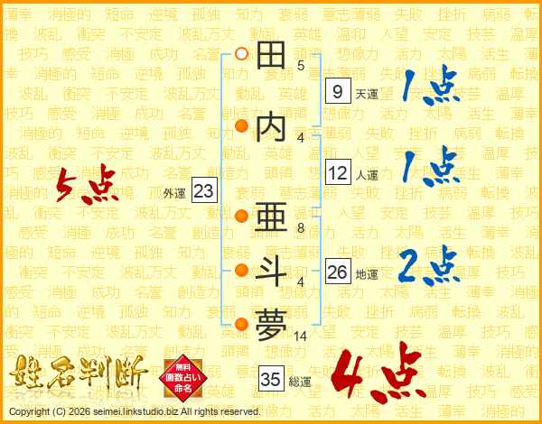 田(5画)内(4画) 亜(8画)斗(4画)夢(14画)