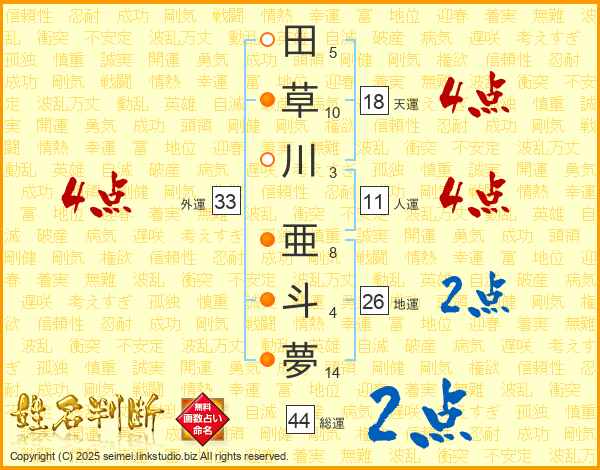 田(5画)草(10画)川(3画) 亜(8画)斗(4画)夢(14画)