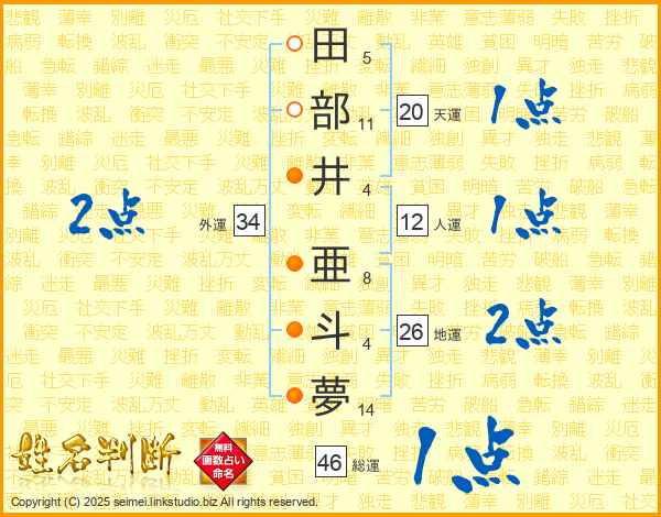 田(5画)部(11画)井(4画) 亜(8画)斗(4画)夢(14画)