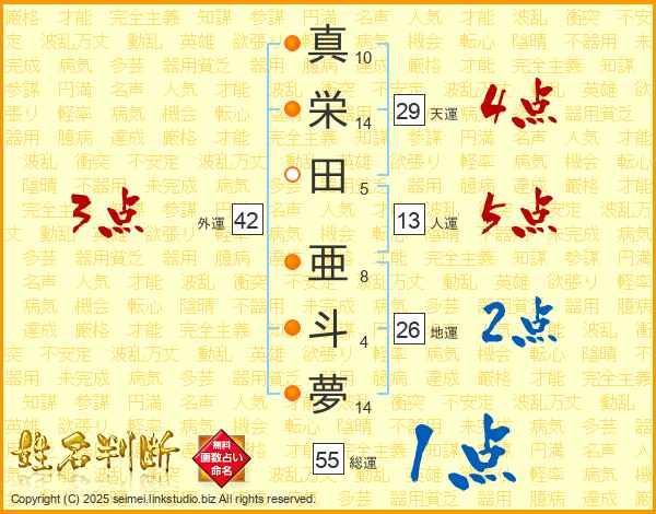 真(10画)栄(14画)田(5画) 亜(8画)斗(4画)夢(14画)