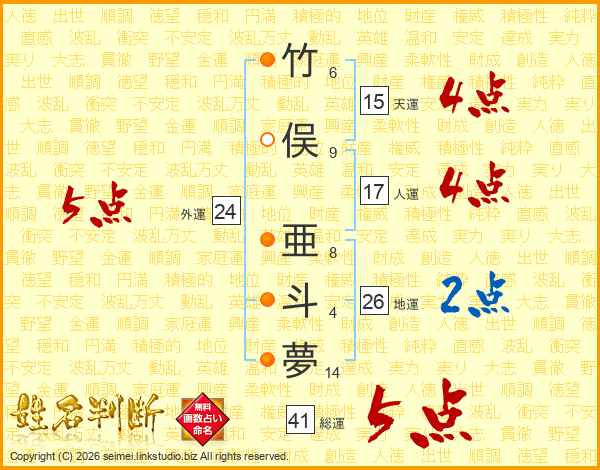 生活面を象徴する運勢です。外部から受ける影響力を表し、結婚運、家庭運や職場、環境への順応性を表します。総運から人運を引いた画数。姓や名が1文字の場合を除く。
