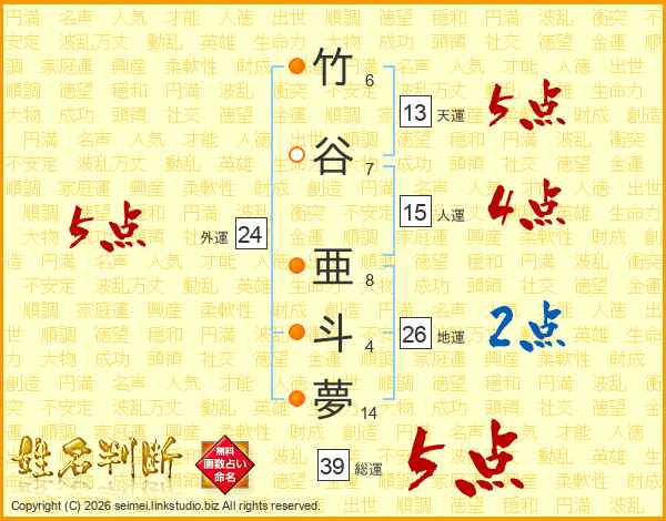 竹谷亜斗夢さんの総運は39画の5点!