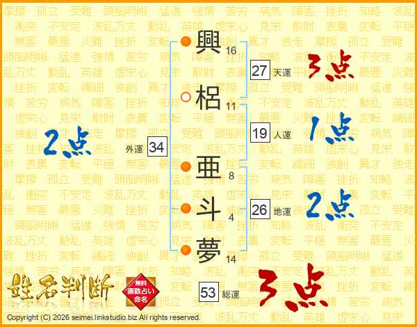 興(16画)梠(11画) 亜(8画)斗(4画)夢(14画)