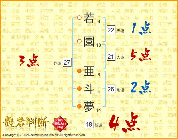 若(9画)園(13画) 亜(8画)斗(4画)夢(14画)