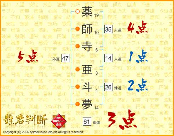 薬師寺亜斗夢さんの外運は47画の5点!