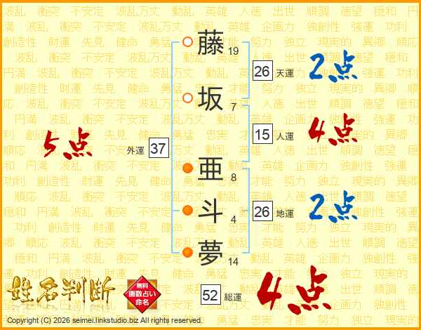 藤坂亜斗夢さんの総運は52画の4点!