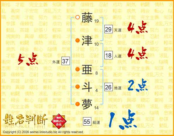 藤津亜斗夢さんの天運は29画の4点!