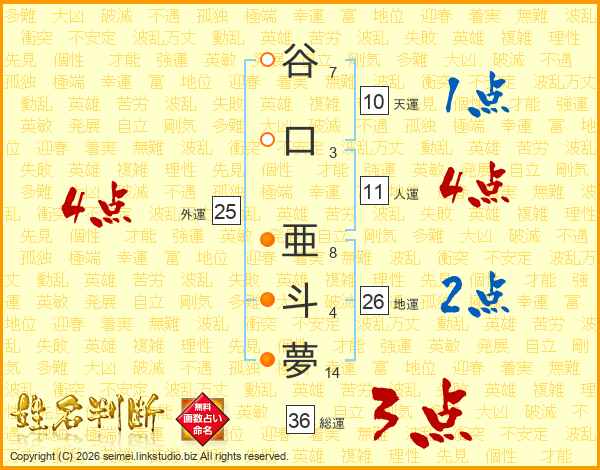 谷(7画)口(3画) 亜(8画)斗(4画)夢(14画)