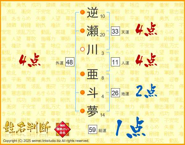 逆瀬川亜斗夢さんの総運は59画の1点!