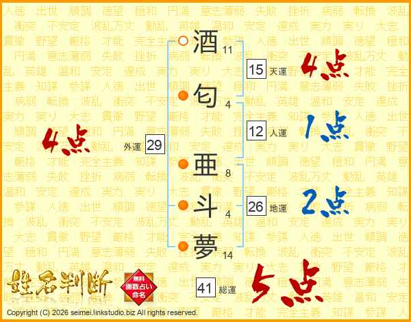 酒(11画)匂(4画) 亜(8画)斗(4画)夢(14画)