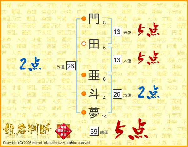 門田亜斗夢さんの総運は39画の5点!
