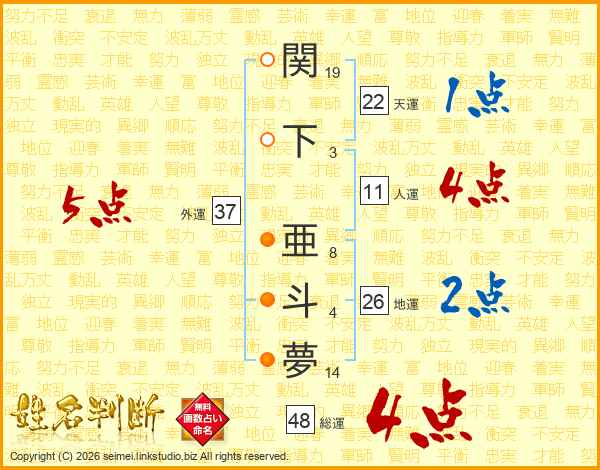 関(19画)下(3画) 亜(8画)斗(4画)夢(14画)