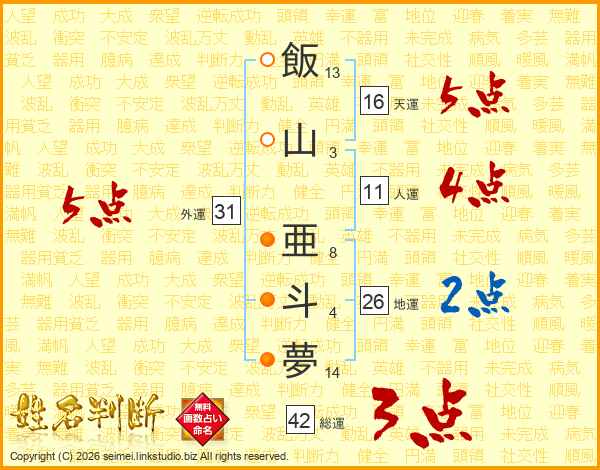 飯(13画)山(3画) 亜(8画)斗(4画)夢(14画)