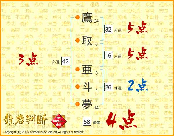 鷹取亜斗夢さんの総運は58画の4点!