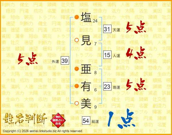 塩(24画)見(7画) 亜(8画)有(6画)美(9画)