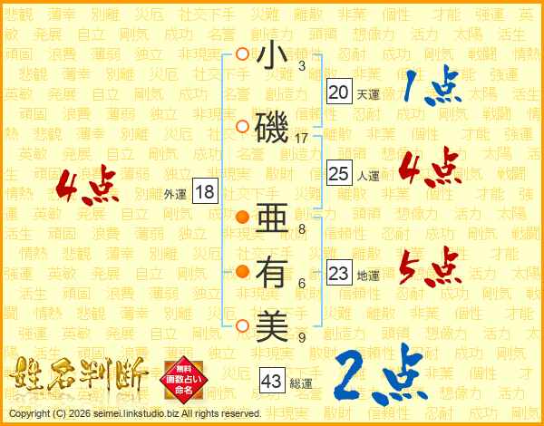 小磯亜有美さんの総運は43画の2点!