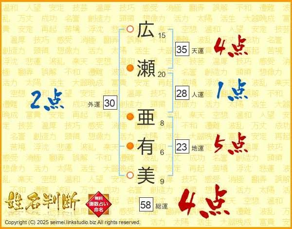 広(15画)瀬(20画) 亜(8画)有(6画)美(9画)