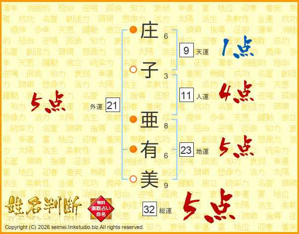 庄(6画)子(3画) 亜(8画)有(6画)美(9画)
