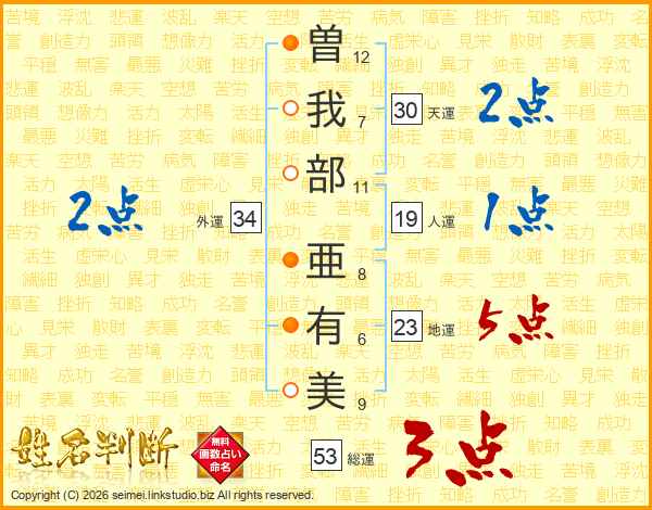 曽(12画)我(7画)部(11画) 亜(8画)有(6画)美(9画)