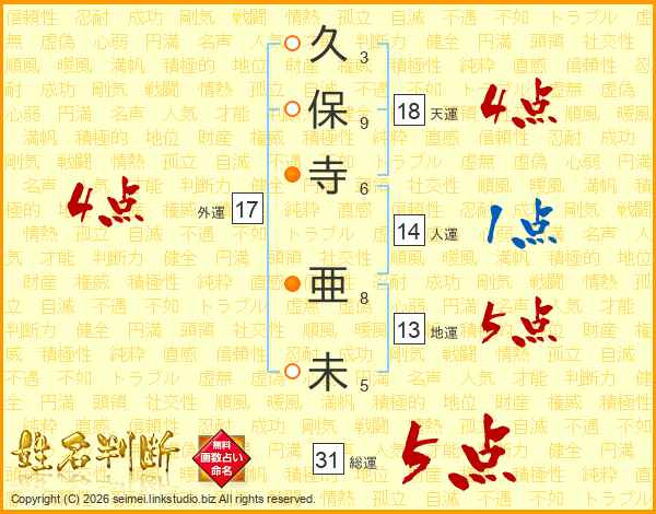 久(3画)保(9画)寺(6画) 亜(8画)未(5画)