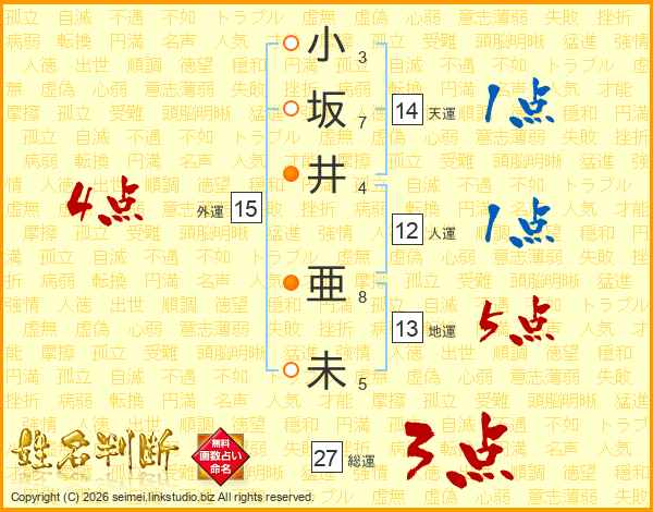 小(3画)坂(7画)井(4画) 亜(8画)未(5画)