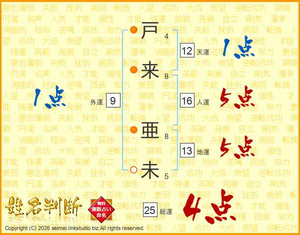 生活面を象徴する運勢です。外部から受ける影響力を表し、結婚運、家庭運や職場、環境への順応性を表します。総運から人運を引いた画数。姓や名が1文字の場合を除く。
