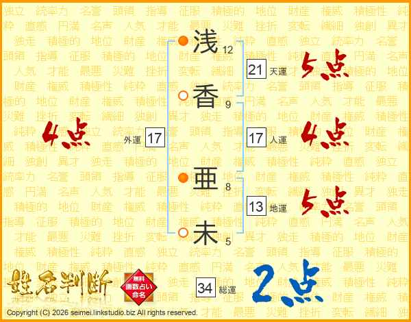生活面を象徴する運勢です。外部から受ける影響力を表し、結婚運、家庭運や職場、環境への順応性を表します。総運から人運を引いた画数。姓や名が1文字の場合を除く。