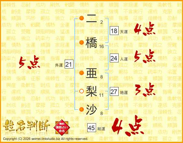 二橋亜梨沙さんの総運は45画の4点!