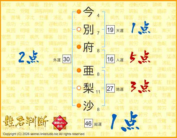 今(4画)別(7画)府(8画) 亜(8画)梨(11画)沙(8画)