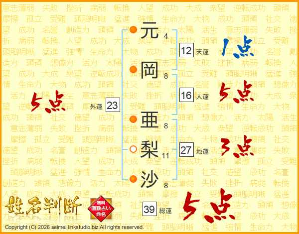 元(4画)岡(8画) 亜(8画)梨(11画)沙(8画)
