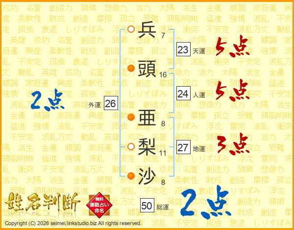 兵頭亜梨沙さんの外運は26画の2点!