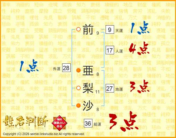 前(9画) 亜(8画)梨(11画)沙(8画)