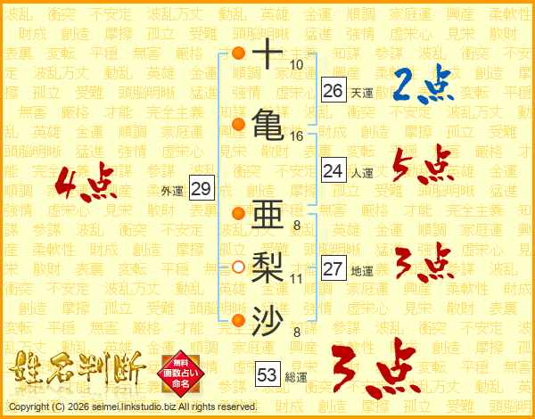 十(10画)亀(16画) 亜(8画)梨(11画)沙(8画)