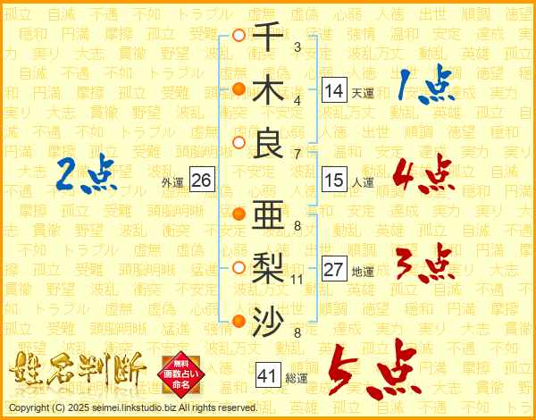 千(3画)木(4画)良(7画) 亜(8画)梨(11画)沙(8画)