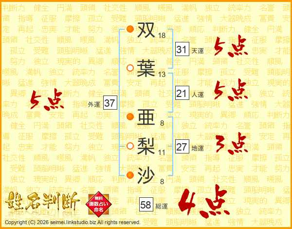 双(18画)葉(13画) 亜(8画)梨(11画)沙(8画)