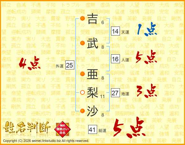 吉(6画)武(8画)  亜(8画)梨(11画)沙(8画)