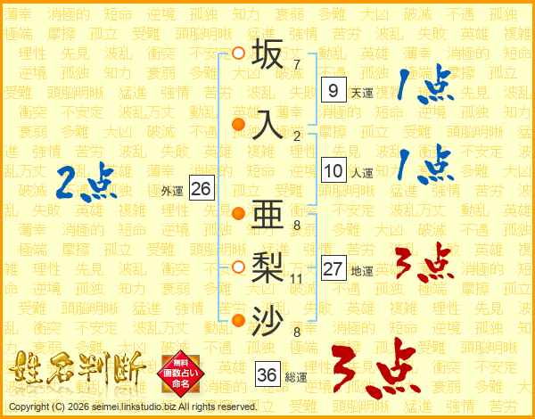 坂(7画)入(2画) 亜(8画)梨(11画)沙(8画)
