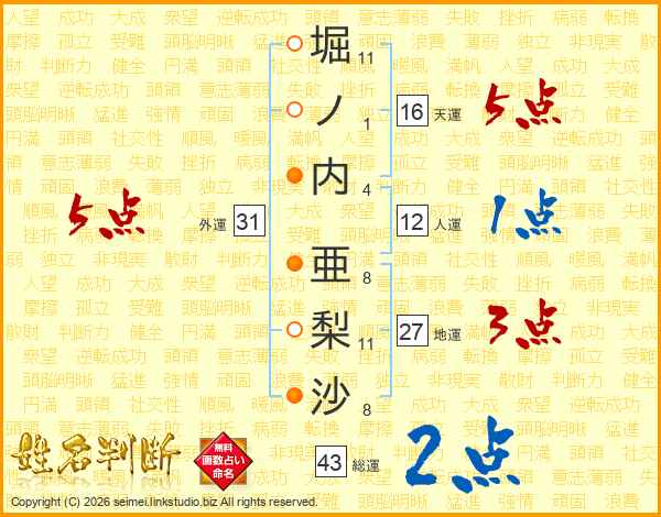 堀(11画)ノ(1画)内(4画) 亜(8画)梨(11画)沙(8画)