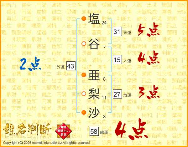塩(24画)谷(7画) 亜(8画)梨(11画)沙(8画)
