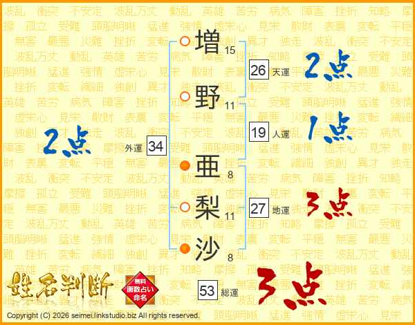 増(15画)野(11画) 亜(8画)梨(11画)沙(8画)