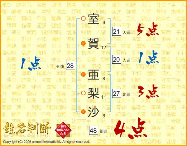 室(9画)賀(12画) 亜(8画)梨(11画)沙(8画)