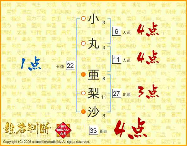 小(3画)丸(3画) 亜(8画)梨(11画)沙(8画)