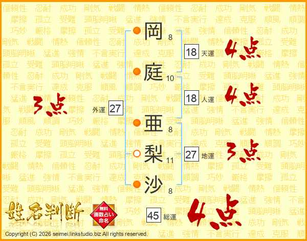 岡(8画)庭(10画) 亜(8画)梨(11画)沙(8画)