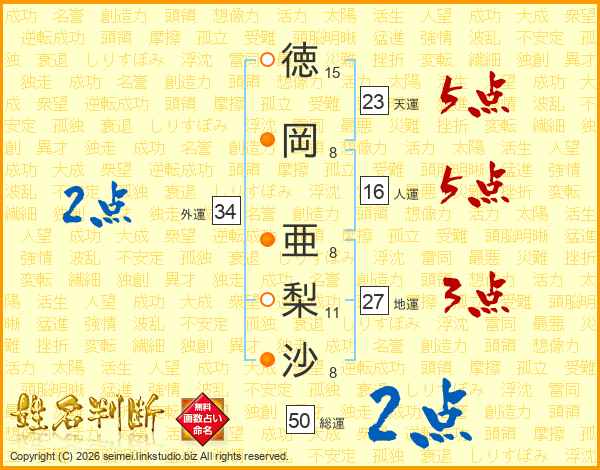 徳(15画)岡(8画) 亜(8画)梨(11画)沙(8画)