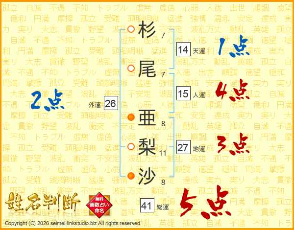 杉(7画)尾(7画) 亜(8画)梨(11画)沙(8画)