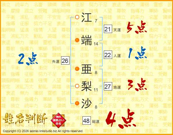 江(7画)端(14画) 亜(8画)梨(11画)沙(8画)