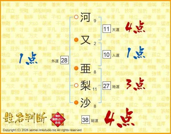 河(9画)又(2画) 亜(8画)梨(11画)沙(8画)