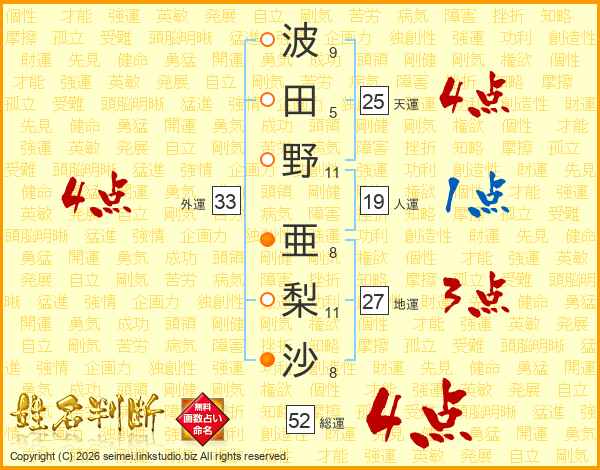 波(9画)田(5画)野(11画) 亜(8画)梨(11画)沙(8画)