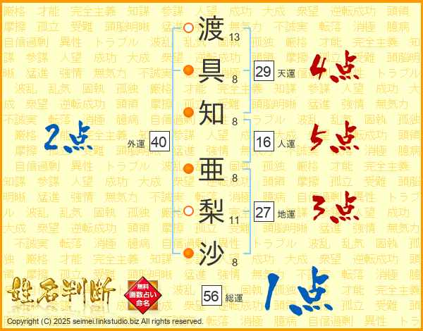 渡(13画)具(8画)知(8画) 亜(8画)梨(11画)沙(8画)