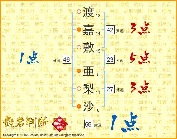 渡嘉敷亜梨沙さんの人運は23画の5点!